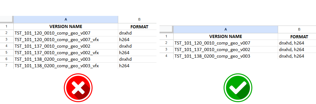 There should be only one row per version number (not per codec/format). Duplicate Version rows will be ignored.
